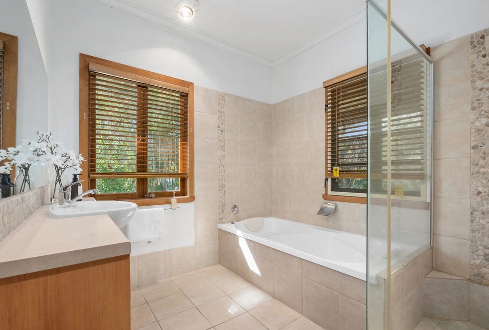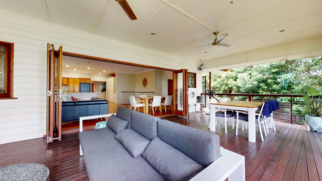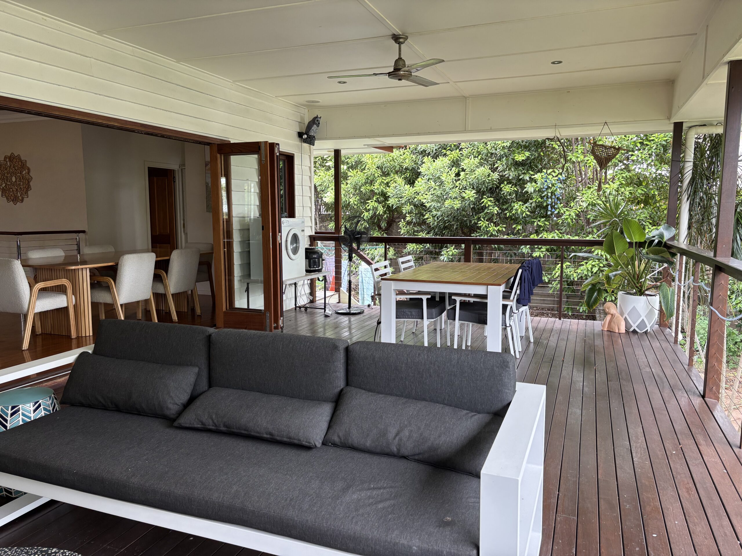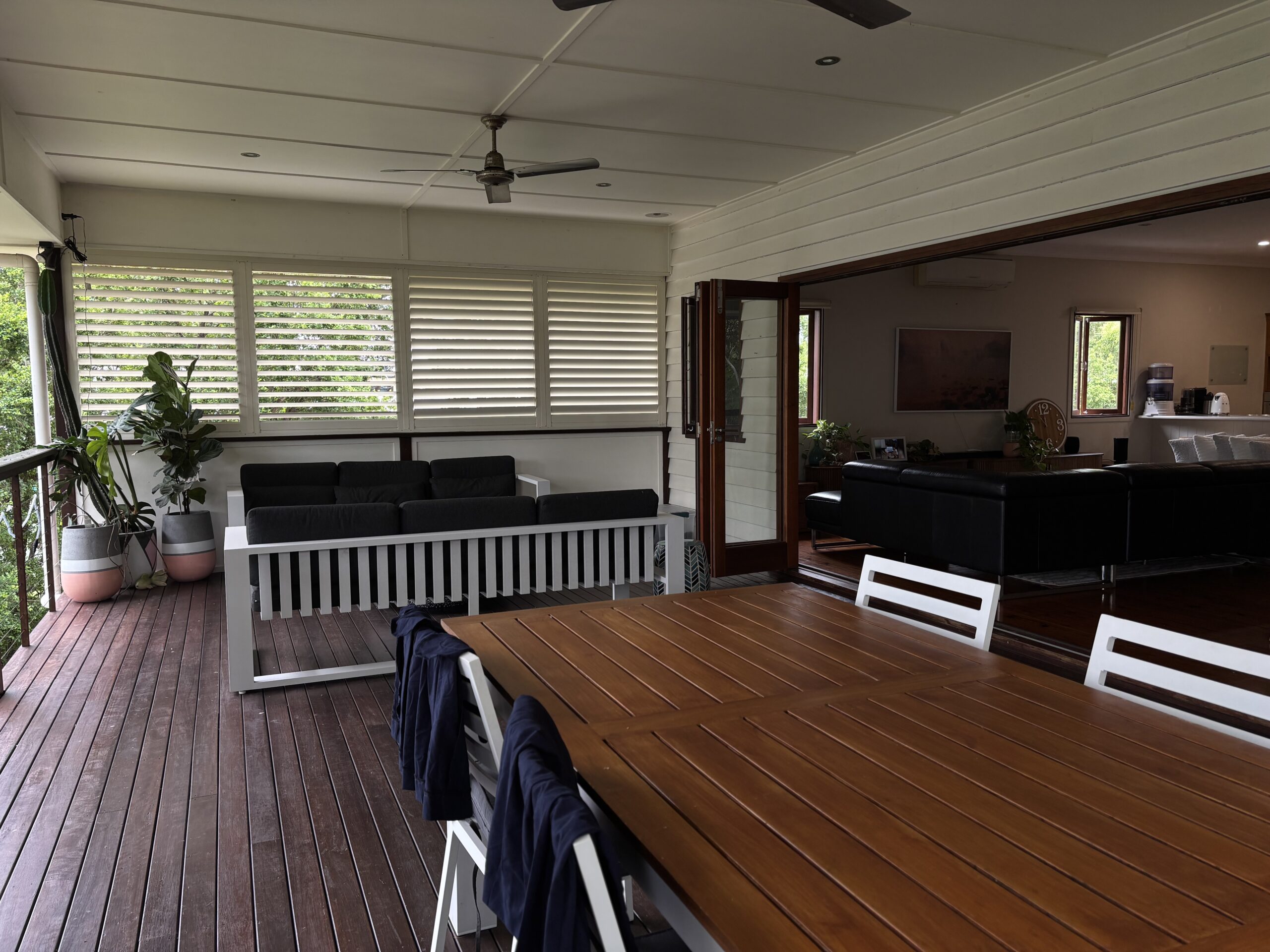 Open it up and you’ve got wide sliding doors flowing straight onto a covered deck, fitted with ceiling fans and louvre-style shutters, perfect for breezy afternoons, long lunches and slow evenings.