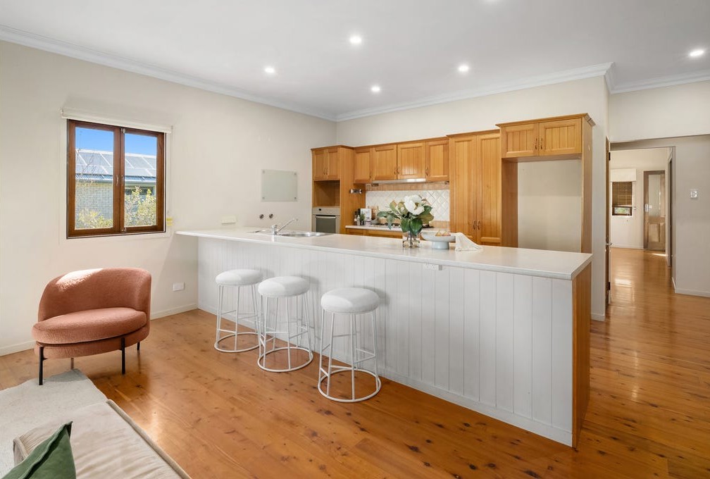 Step inside and you’re met with a huge open-plan living and kitchen zone, polished timber floors, recessed lighting and split-system air conditioning for year-round comfort. The kitchen is made for entertaining, long island bench, loads of storage and a layout that keeps you in the conversation while you cook (or pretend you’re cooking).